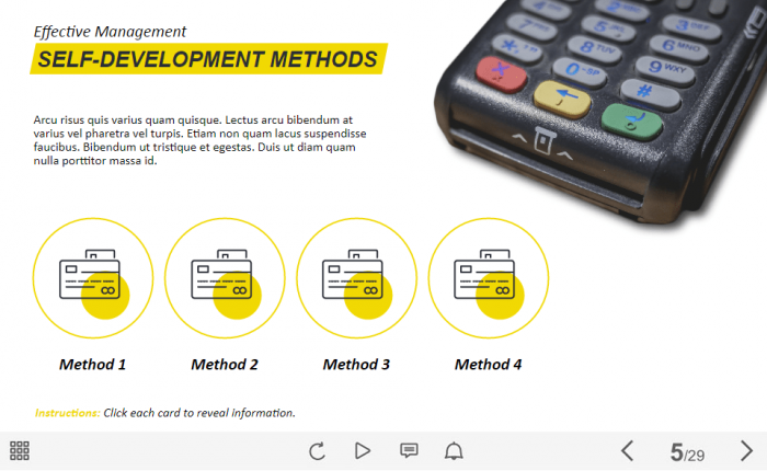 Click the Credit Cards — Lectora Template. The unique eLearning interaction is designed with Trivantis Lectora 18 software. The template contains 4 clickable objects designed as credit cards. The user must click on each card to reveal the additional materials. The template slide is a ready-made product: all you need is to insert it into the projects and fill with own training content. It’s recommended to launch it on the devices with the screen size more than 7 inches.