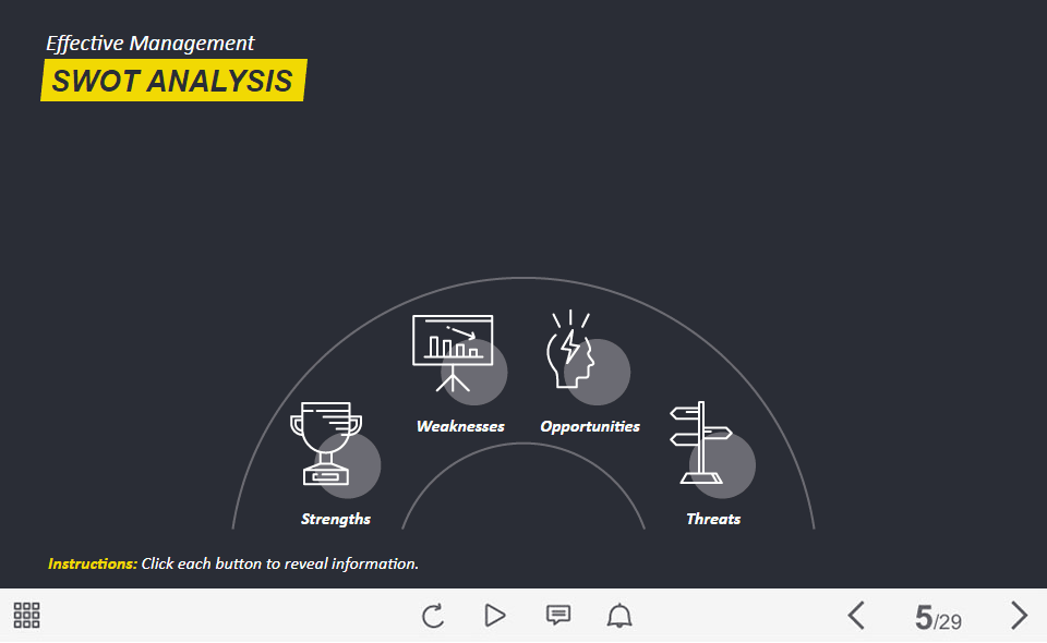 Four Icon Buttons — Lectora Template. The unique eLearning interaction is designed with Lectora 18 tool. The template contains 4 clickable icons placed at the bottom part of the screen. The user must click each of them to reveal the additional materials. The template slide is a ready-made product: all you need is to insert it into the projects and fill with own training content. It’s recommended to launch it on the devices with the screen size more than 7 inches.