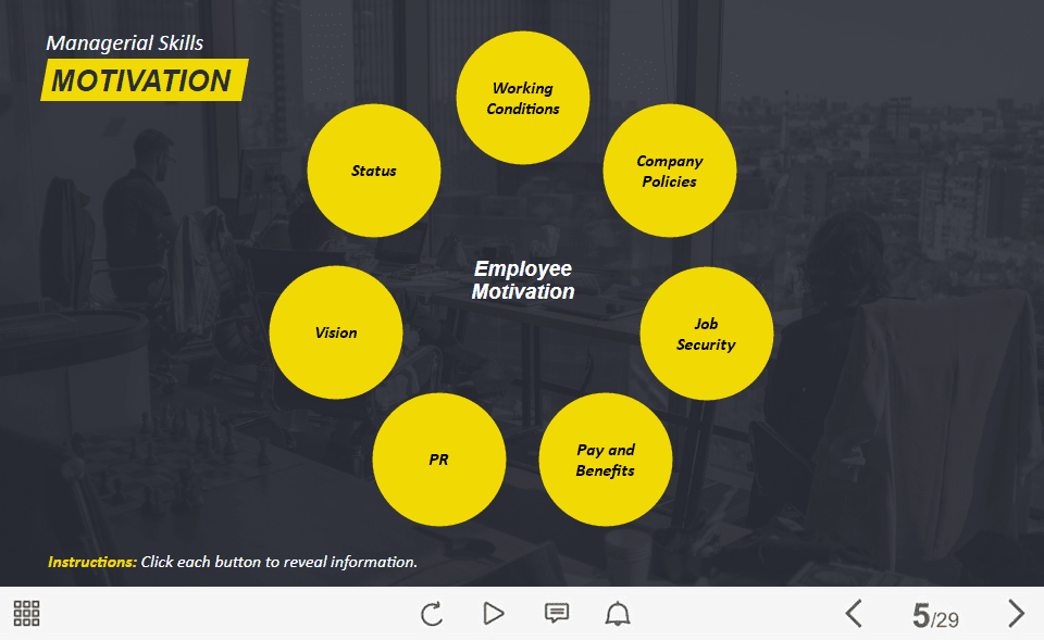 Employee Motivation Buttons — Lectora Template. The unique eLearning interaction is designed with Lectora 18 tool. The template contains 7 round buttons placed at the right part of the screen. The user must click each of them to reveal the additional materials. The template slide is a ready-made product: all you need is to insert it into the projects and fill with own training content. It’s recommended to launch it on the devices with the screen size more than 7 inches.