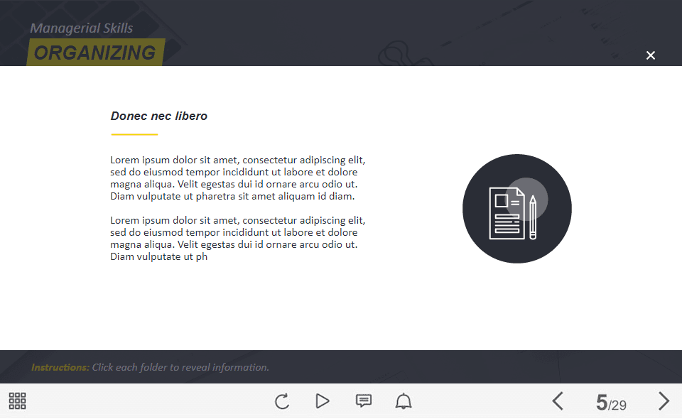 Five Folder Buttons — Lectora Template. The unique eLearning interaction is designed with Lectora 18 tool. The template contains 5 clickable objects designed as numbered folders. The user must click each of them to reveal the additional materials in pop-ups. The template slide is a ready-made product: all you need is to insert it into the projects and fill with own training content. It’s recommended to launch it on the devices with the screen size more than 7 inches.