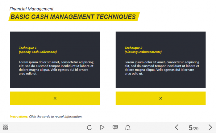Two Flip Cards — Lectora Template. The unique eLearning interaction is designed with Lectora 18 tool. The template contains 2 two clickable flip cards. The user must click each of them to reveal the additional materials. The template slide is a ready-made product: all you need is to insert it into the projects and fill with own training content. It’s recommended to launch it on the devices with the screen size more than 7 inches.
