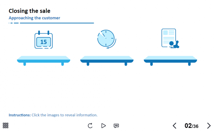 Clickable Shelves with Icons — Lectora Template. The unique eLearning interaction is designed with Lectora 18 tool. The template contains three clickable shelves with icons. The user must click on each of them to reveal the additional information. The template slide is a ready-made product: all you need is to insert it into the projects and fill with own training content. We recommend to launch it on the devices with the screen size more than 7 inches. We’ve collected lots of Trivantis Lectora templates to speed up the course development and to save you from routine work.