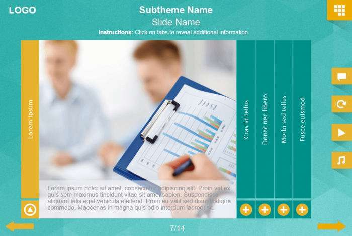 The course player contains character, flip-chart image and three versions of image slides. Different types of interactions invented to display any kind of additional information by clicking on visual objects. All items are already designed and prepared for usage.