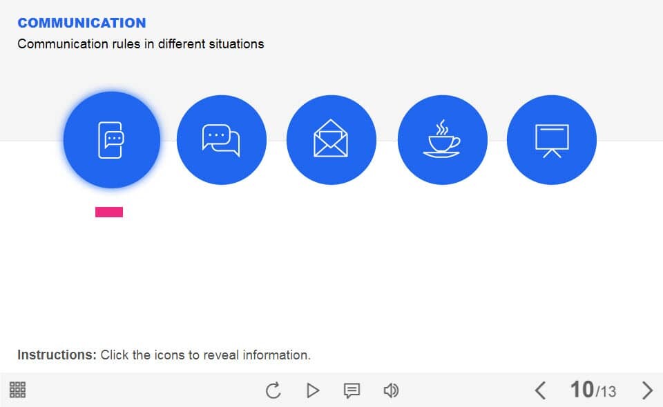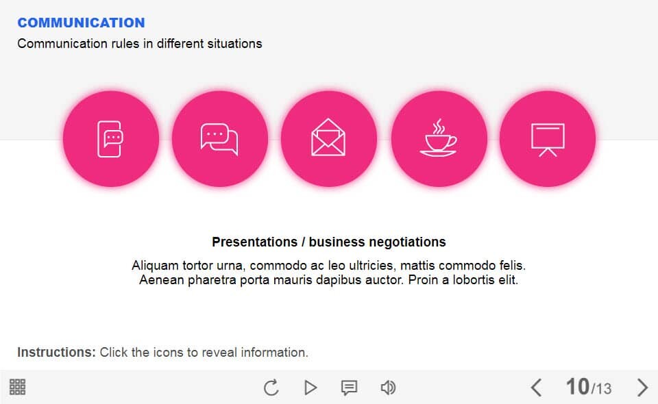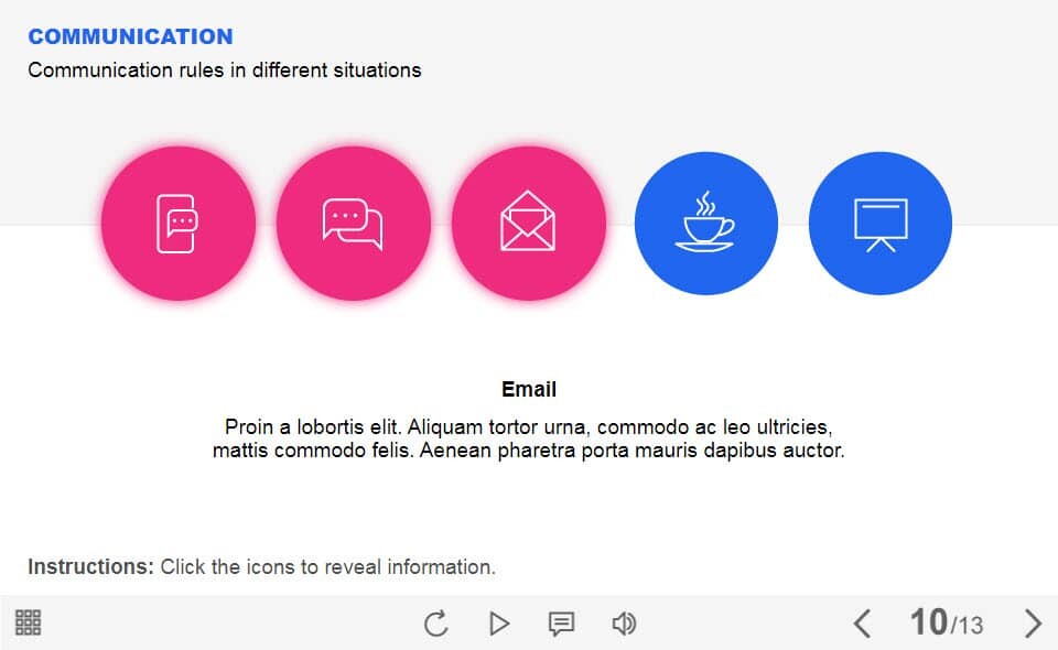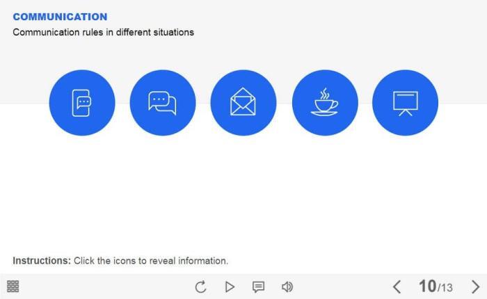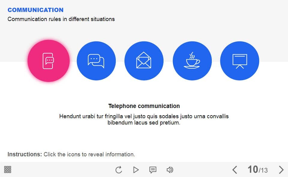 Communication Icons — Lectora Template. The unique eLearning interaction is designed with Lectora 18. The template contains 5 round icons. The user must click each of them to reveal the additional materials. The template is a ready-made product: all you need is to insert it into the projects and fill with own training content. It’s recommended to launch it on the devices with the screen size more than 7 inches.