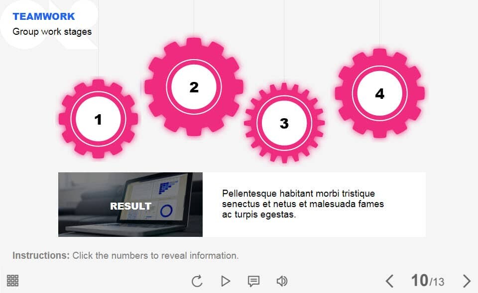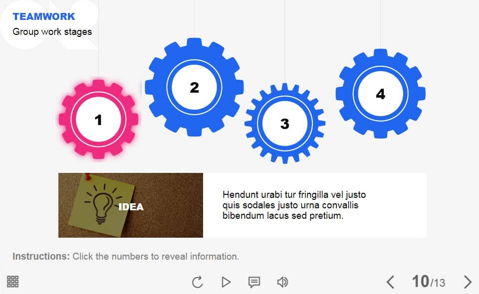 Teamwork Gears — Lectora Template. The unique eLearning interaction is designed with Lectora 18. The template contains 4 clickable objects designed as gears. The user must click each of them to reveal the additional materials. The template is a ready-made product: all you need is to insert it into the projects and fill with own training content. It’s recommended to launch it on the devices with the screen size more than 7 inches.