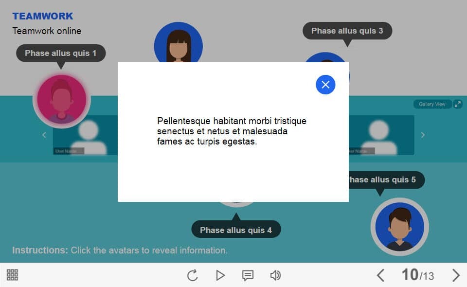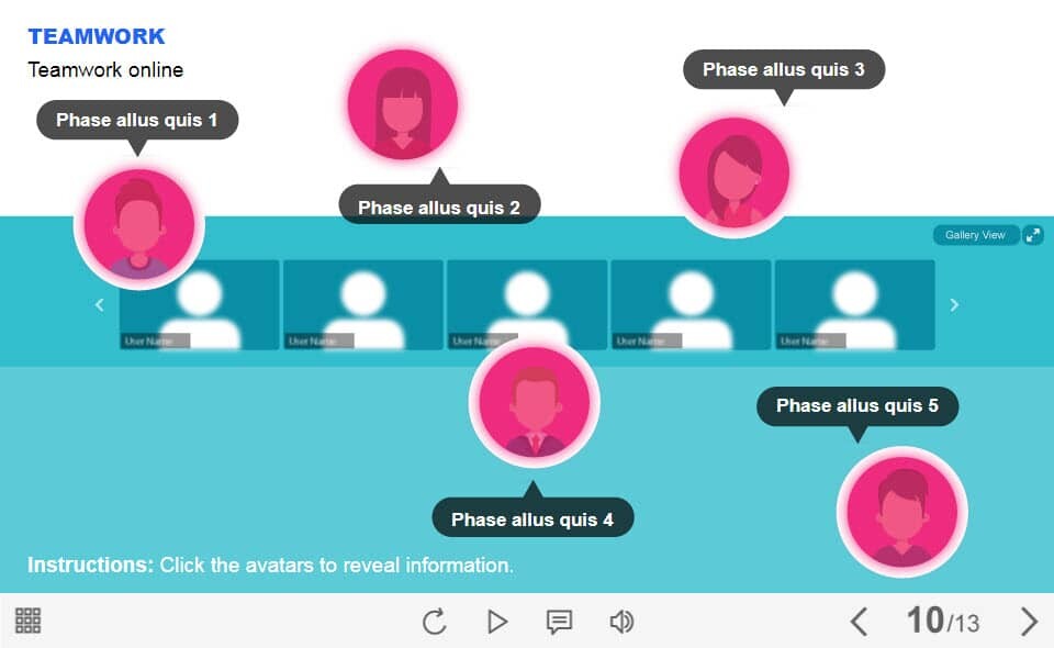 Online Teamwork — Lectora Template. The unique eLearning interaction is designed with Lectora 18. The template contains 5 round buttons designed as people’s avatars. The user must click each of them to reveal the additional materials in pop-up windows. The template is a ready-made product: all you need is to insert it into the projects and fill with own training content. It’s recommended to launch it on the devices with the screen size more than 7 inches.