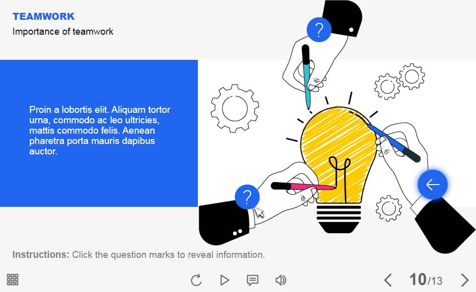 Importance of Teamwork — Lectora Template. The unique eLearning interaction is designed with Lectora 18. The template contains 3 round markers arranged at the right part of the screen. The user must click each of them to reveal the additional materials. The template is a ready-made product: all you need is to insert it into the projects and fill with own training content. It’s recommended to launch it on the devices with the screen size more than 7 inches.