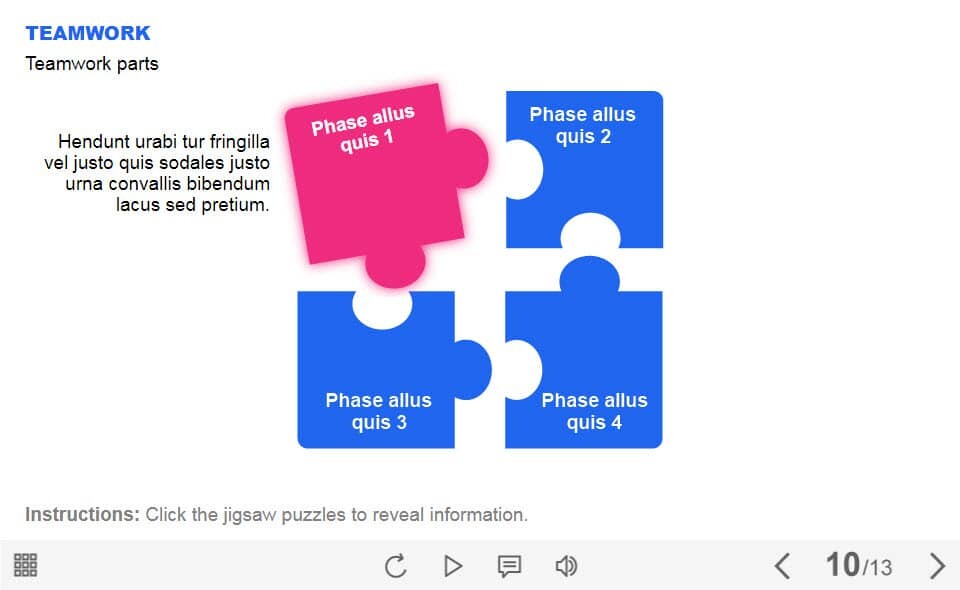 Teamwork Parts — Lectora Template. The unique eLearning interaction is designed with Lectora 18. The template contains 4 clickable objects designed as pieces of a jigsaw puzzle. The user must click each of them to reveal the additional materials. The template is a ready-made product: all you need is to insert it into the projects and fill with own training content. It’s recommended to launch it on the devices with the screen size more than 7 inches.