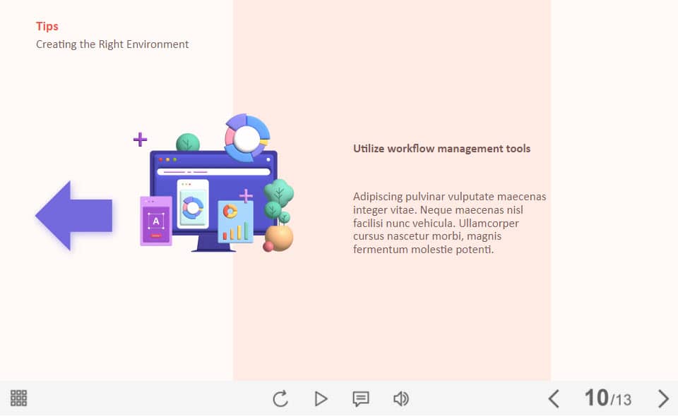 Classic Slideshow — Lectora Template. The unique eLearning interaction is designed with Lectora 18 software. The template a classic slideshow that is composed of 5 slides. The user must click on the right and left arrows to reveal the additional information. The template is a ready-made product: all you need is to insert it into the projects and fill with own training content. It’s recommended to launch it on the devices with the screen size more than 7 inches.