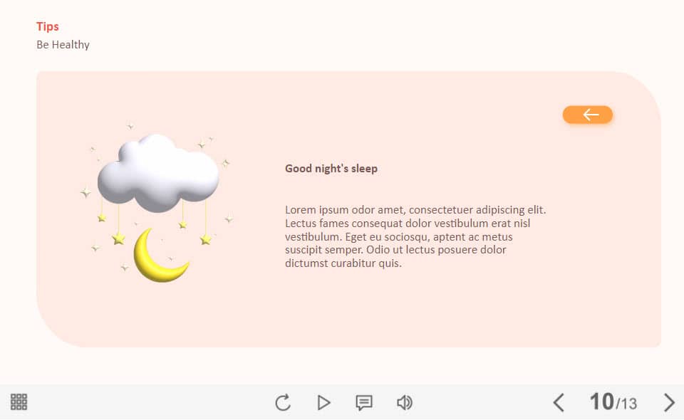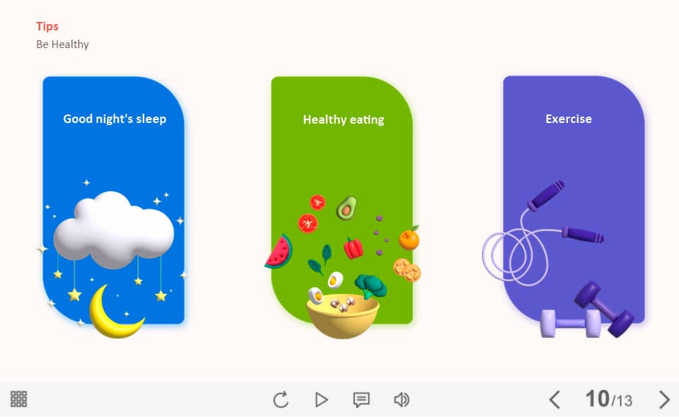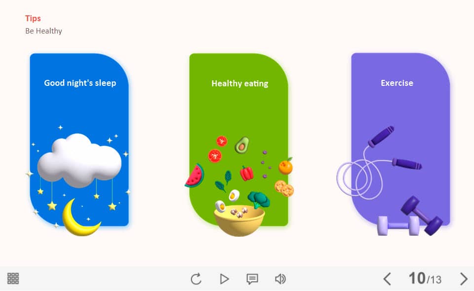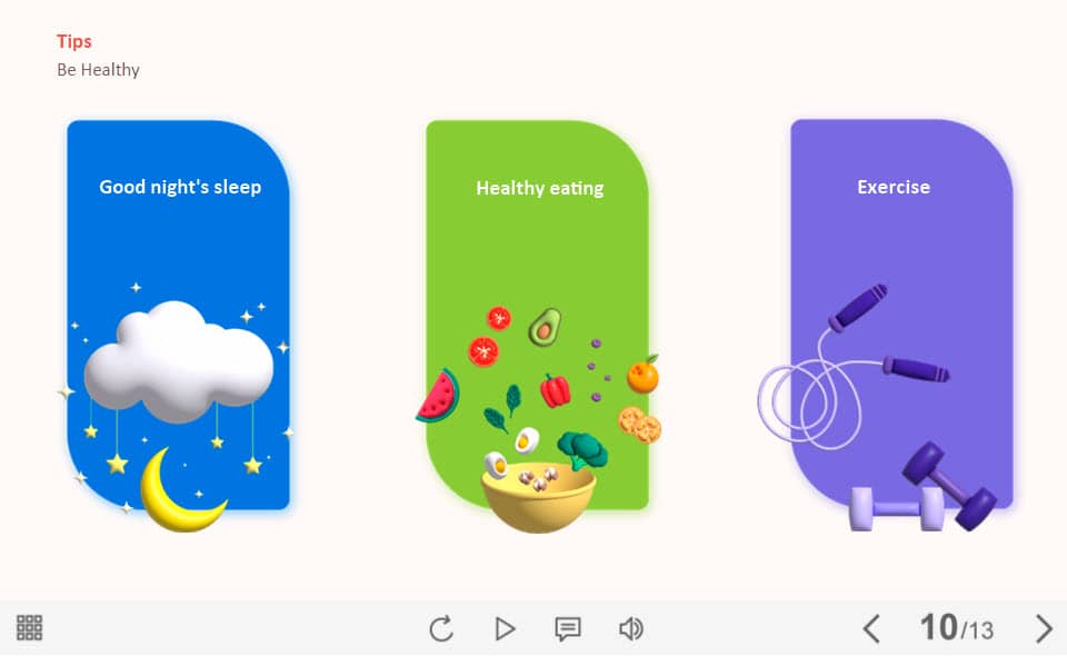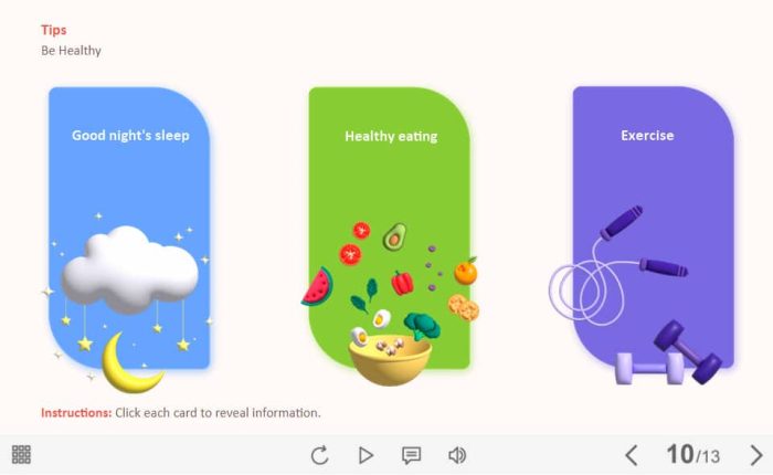 Health Cards — Lectora Template. The unique eLearning interaction is designed with Lectora 18 software. The template contains three clickable cards with graphic objects. The user must click on each card to reveal the additional information in pop-ups. The template is a ready-made product: all you need is to insert it into the projects and fill with own training content. It’s recommended to launch it on the devices with the screen size more than 7 inches.