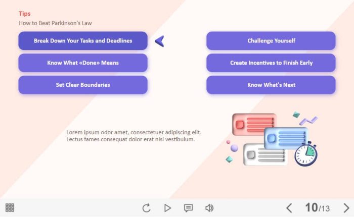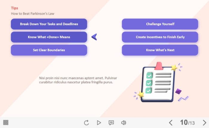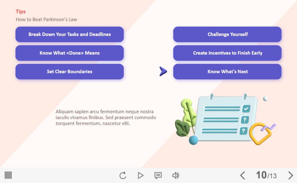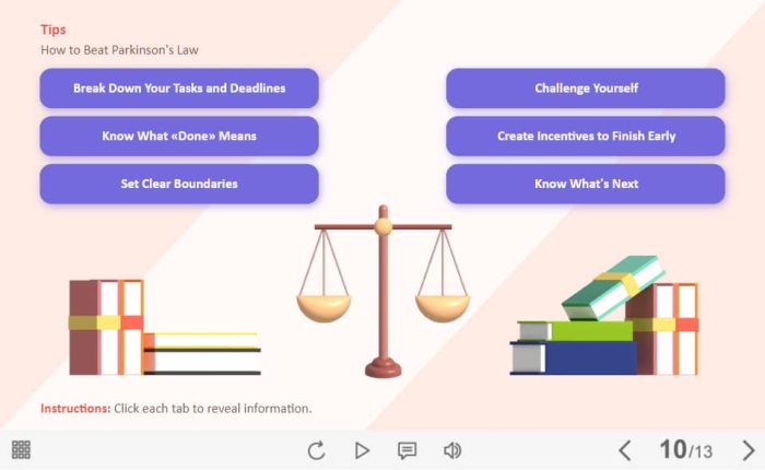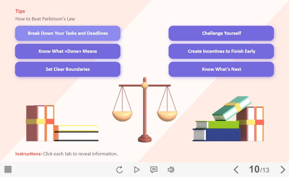 Beating Parkinson’s Law — Lectora Template. The unique eLearning interaction is designed with Lectora 18 software. The template contains six tabs that are placed at the top part of the screen. The user must click on each tab to reveal the additional information. The template is a ready-made product: all you need is to insert it into the projects and fill with own training content. It’s recommended to launch it on the devices with the screen size more than 7 inches.