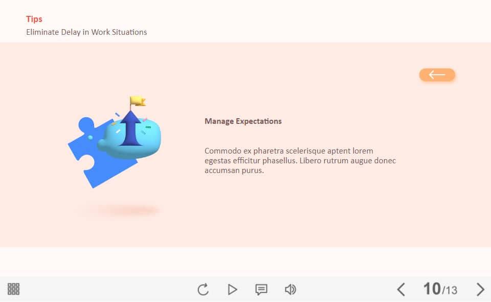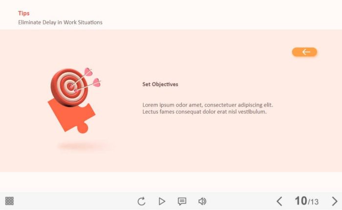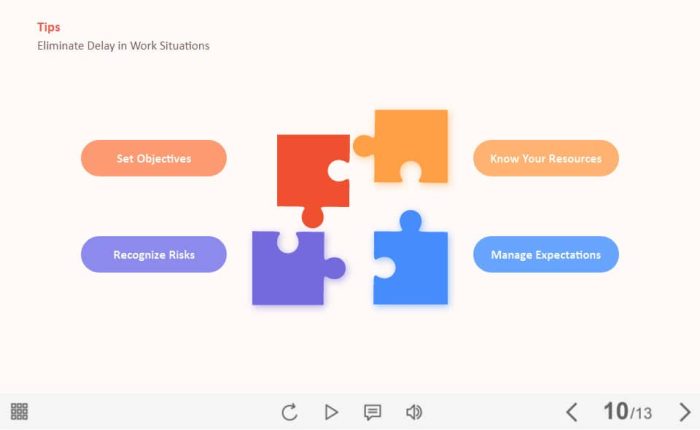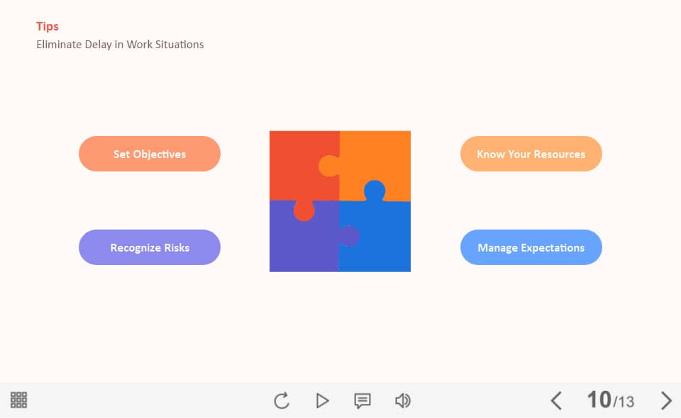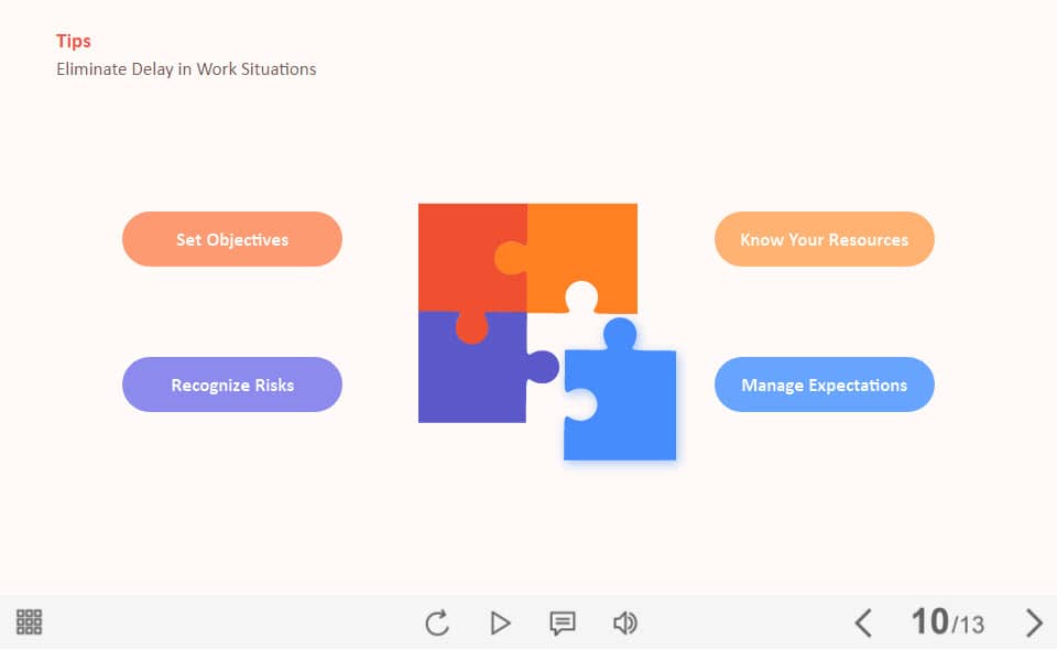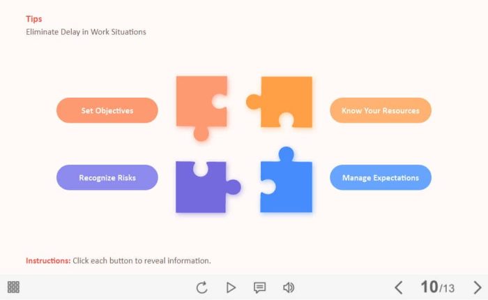 Eliminate Delay in Work Situations — Lectora Template. The unique eLearning interaction is designed with Lectora 18 software. The template contains four clickable objects designed as jigsaw puzzle pieces. The user must click on each of them to reveal the additional information. The template is a ready-made product: all you need is to insert it into the projects and fill with own training content. It’s recommended to launch it on the devices with the screen size more than 7 inches.