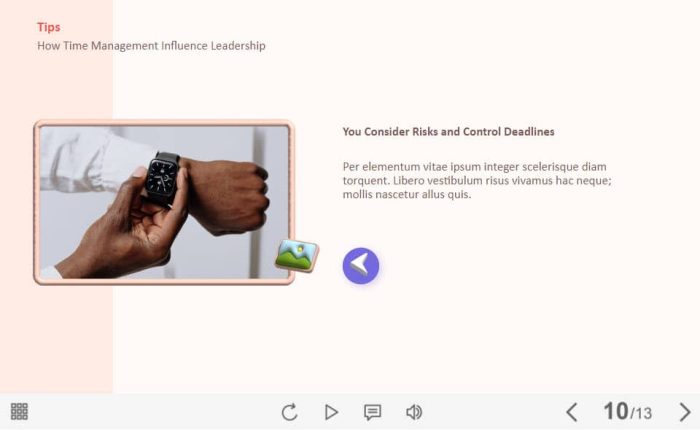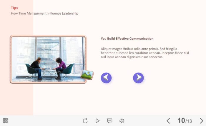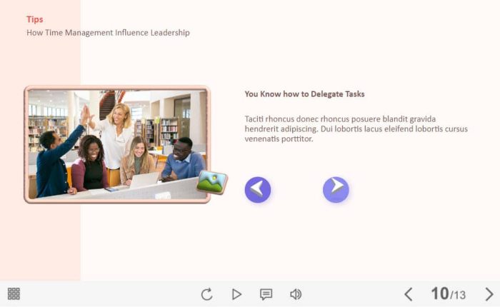 Time Management Influence Leadership — Lectora Template. The unique eLearning interaction is designed with Lectora 18 software. The template represents a classic slideshow that is composed of four slides. The user must click the right and left arrows to reveal the additional information. The template is a ready-made product: all you need is to insert it into the projects and fill with own training content. It’s recommended to launch it on the devices with the screen size more than 7 inches.