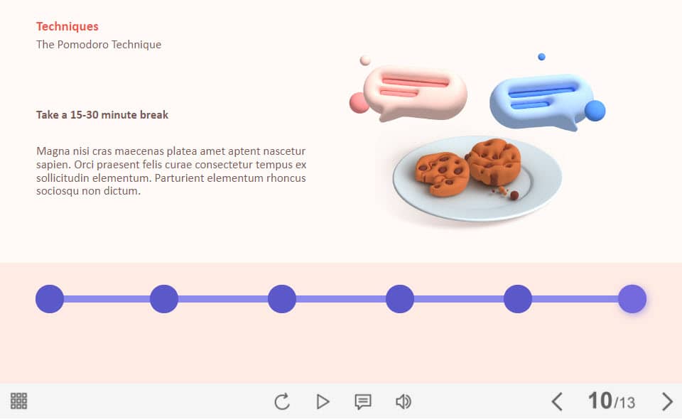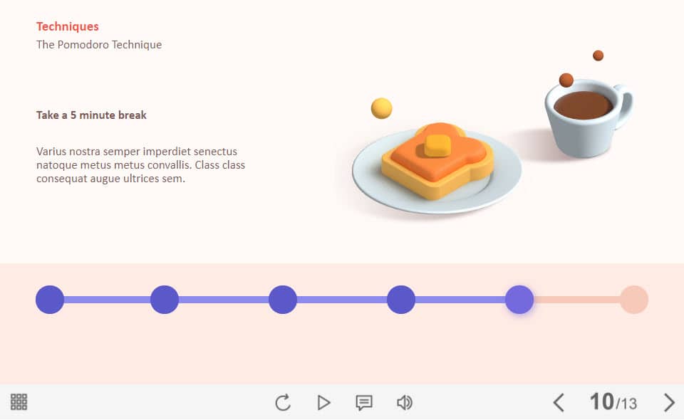 The Pomodoro Technique — Lectora Template. The unique eLearning interaction is designed with Lectora 18 software. The template contains a slider with six positions. The user must drag the slider to the right to reveal the additional information. The template is a ready-made product: all you need is to insert it into the projects and fill with own training content. It’s recommended to launch it on the devices with the screen size more than 7 inches.