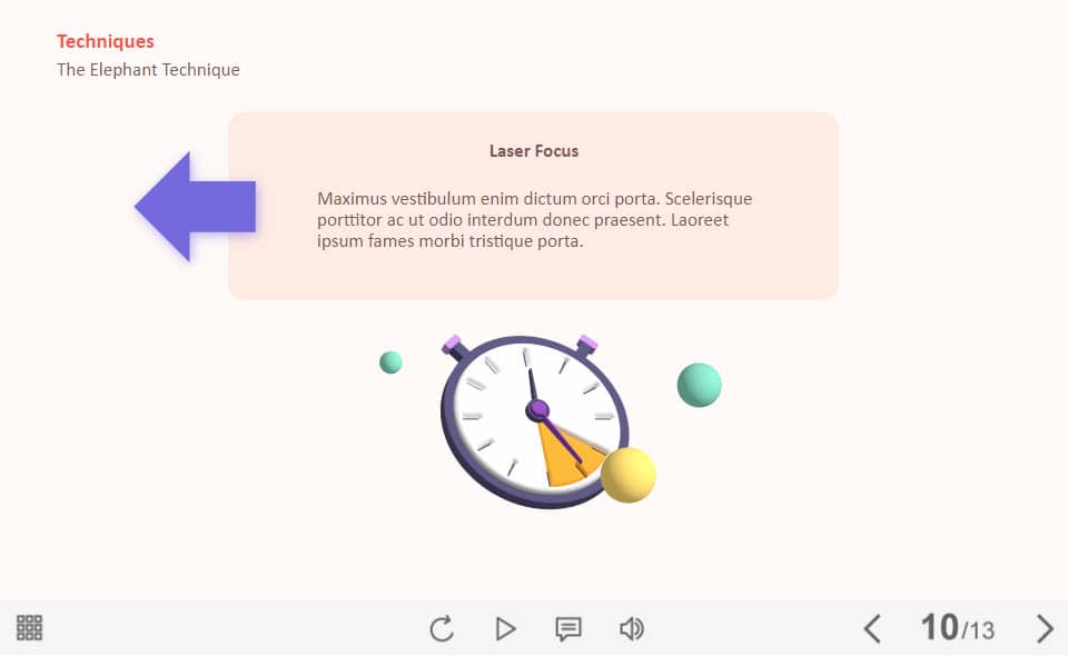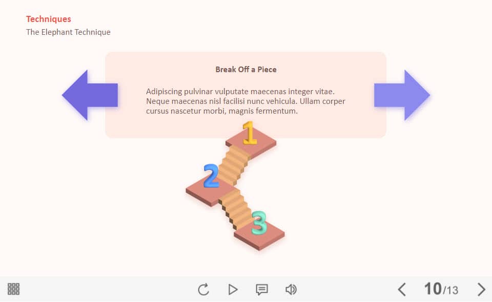 The Elephant Technique — Lectora Template. The unique eLearning interaction is designed with Lectora 18 software. The template represents a classic horizontal slideshow that is composed of 6 slides. The user must click on the right and left buttons to reveal the additional information. The template is a ready-made product: all you need is to insert it into the projects and fill with own training content. It’s recommended to launch it on the devices with the screen size more than 7 inches.