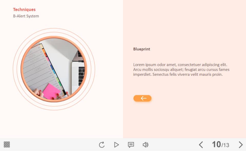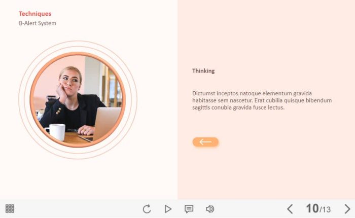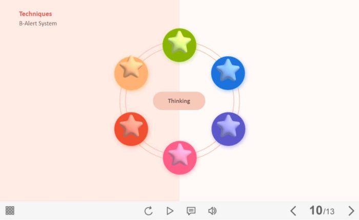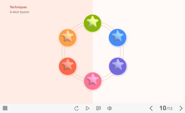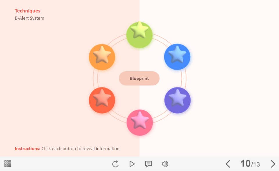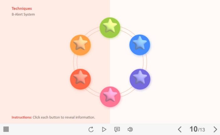 B-Alert System — Lectora Template. The unique eLearning interaction is designed with Lectora 18 software. The template contains six round buttons with star icons. The user must click on each button to reveal the additional information. The template is a ready-made product: all you need is to insert it into the projects and fill with own training content. It’s recommended to launch it on the devices with the screen size more than 7 inches.