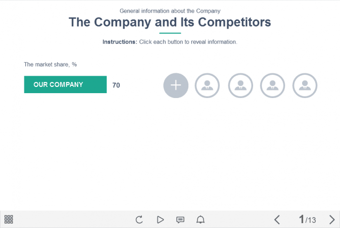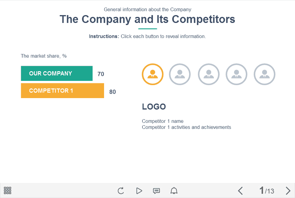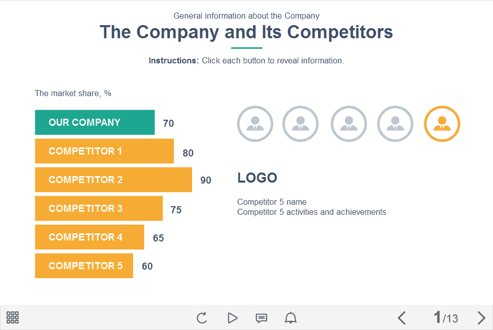 Lectora Indicator Comparison Template. Designed in white, green and orange colours, this Lectora Template would be a perfect choice to provide the course information. It contains five clickable buttons invented to reveal the training materials. After clicking on each buttons the user will be able to compare the main indicator for each subject. The template is based on Lectora Publisher 16 software. It is possible to build it into any Lectora Course Template you need.
