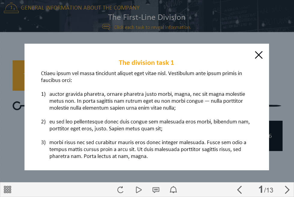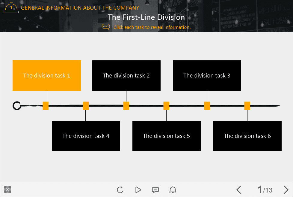 Lectora Six Rectangular Buttons Template. The ready-made interactive slide would be a great helper for creating powerful training courses. It contains 6 clickable buttons designed to reveal the learning materials in pop-ups. The template is already designed and prepared for usage.