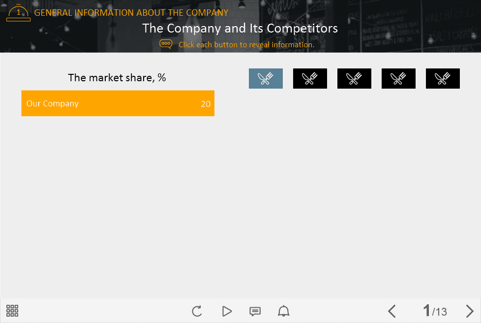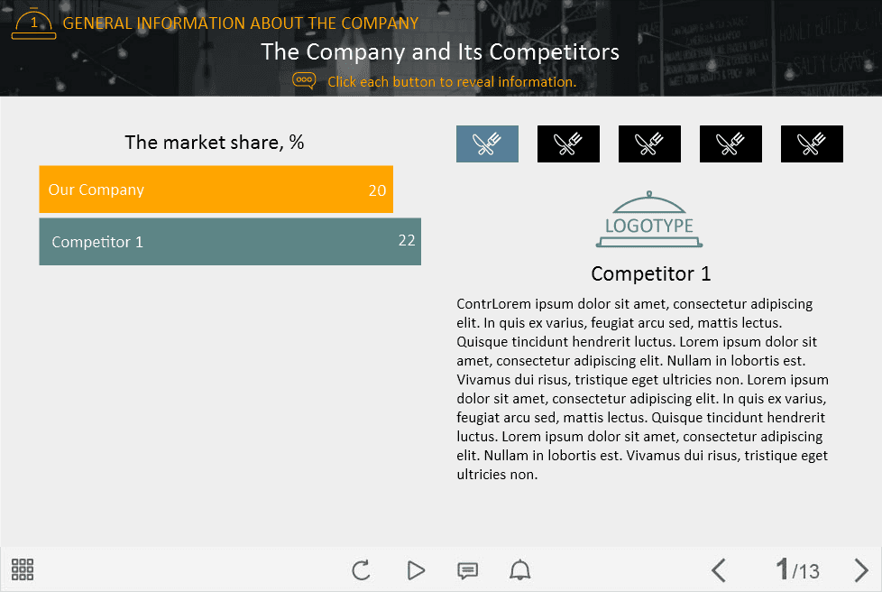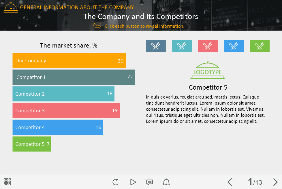 Lectora Company and Competitors Template. The ready-made interactive slide would be a great helper for creating powerful training courses. It contains five clickable tabs invented to reveal the training materials. After clicking on each tab the user will be able to compare the main indicator for each subject. The template is already designed and prepared for usage.
