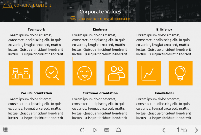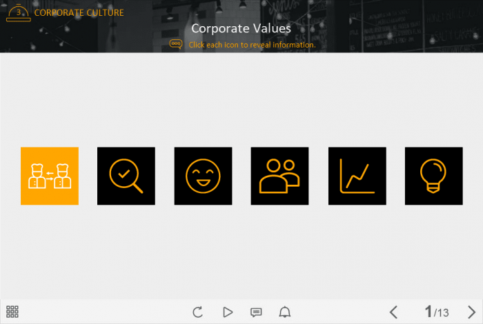 Lectora Six Iconic Buttons Template. The ready-made interactive slide would be a great helper for creating powerful training courses. It contains six iconic buttons which are arranged in the row in the middle part of the screen. The user must click on each button to reveal the course information. The template is already designed and prepared for usage.