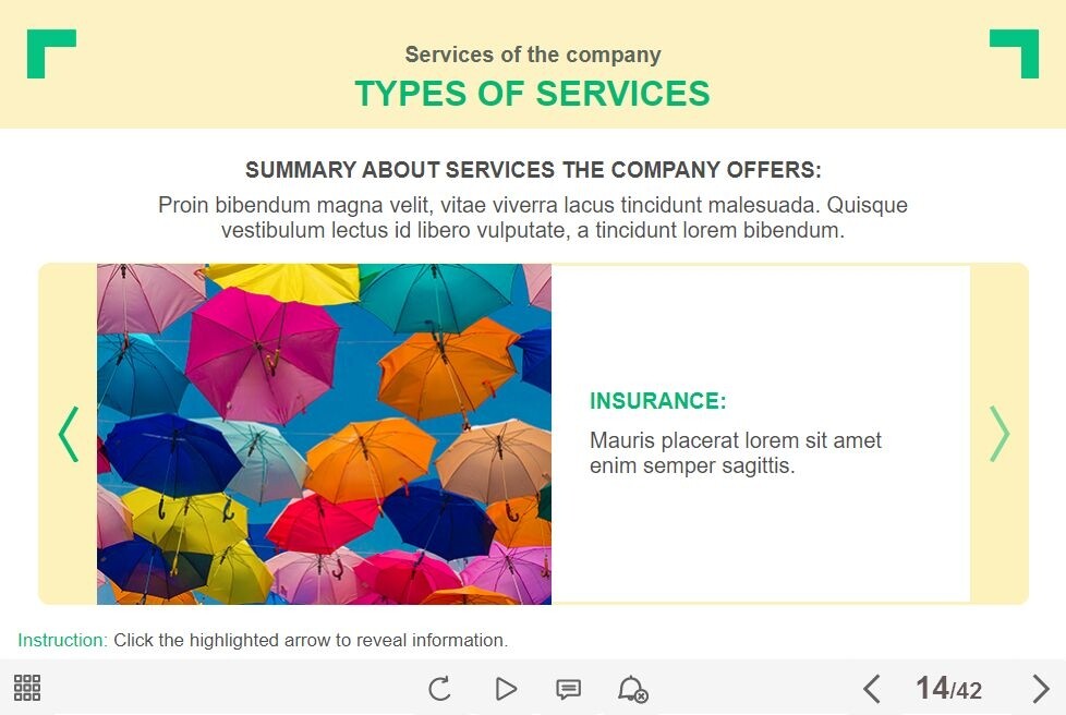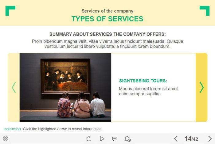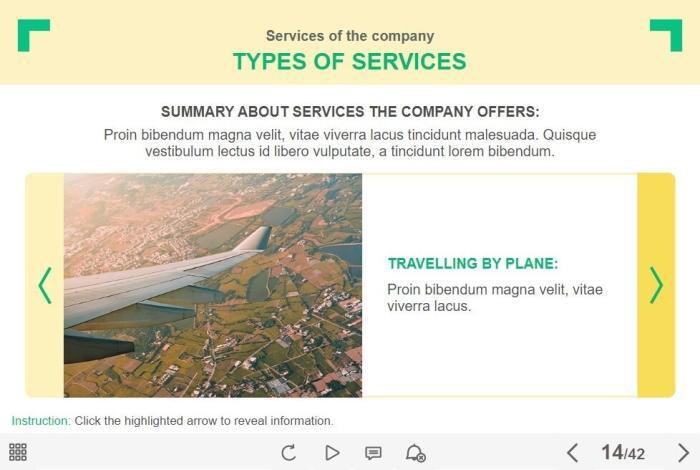 Basic Slideshow — Lectora Template. The template represents a slideshow that is composed of 5 slides. The user must click on the left and right buttons to switch between the slides and to reveal the additional information. This Lectora interaction slide is a part of the Travel Industry Welcome Course Starter Template. It can be used for creating any type of eLearning courses with Lectora Publisher / Inspire 16 or higher. The template is a ready-made product that works well on PCs, laptops and tablets with screen size larger than 7 inches. Feel free to browse through our ready-made Lectora templates library and pick any ones to create own visual stories.