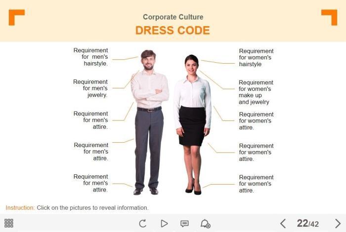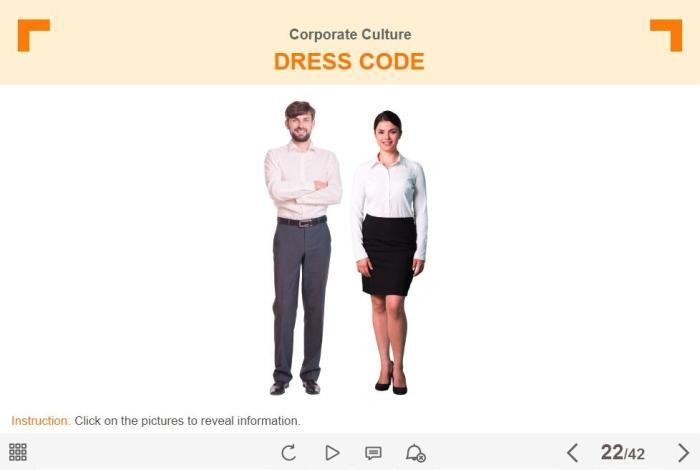 Clickable Characters — Lectora Template. The template contains two cutout people images. The characters are dressed in the formal suits. The user must click on each of them to reveal the additional information. The template would be a great decision for creating the dress code slide. This Lectora interaction slide is a part of the Travel Industry Welcome Course Starter Template. It can be used for creating any type of eLearning courses with Lectora Publisher / Inspire 16 or higher. The template is a ready-made product that works well in PCs, laptops and tablets with screen size larger than 7 inches. Feel free to browse through our ready-made Lectora templates library and pick any ones to create own visual stories.