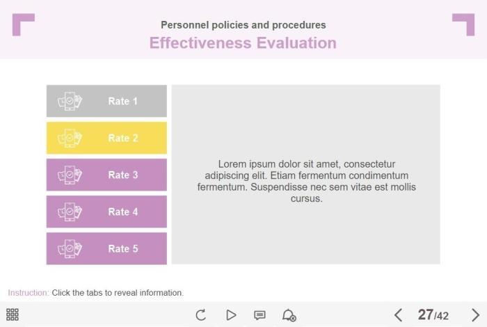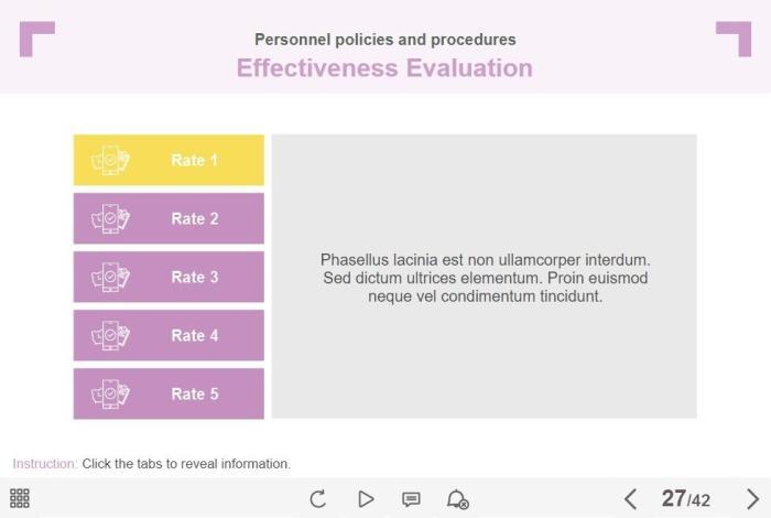 Five Purple Tabs — Lectora Template. The template contains five clickable objects placed on the left part of the screen. The user must click on each of them to reveal the additional information. This Lectora interaction slide is a part of the Travel Industry Welcome Course Starter Template. It can be used for creating any type of eLearning courses with Lectora Publisher / Inspire 16 or higher. The template is a ready-made product that works well in PCs, laptops and tablets with screen size larger than 7 inches. Feel free to browse through our ready-made Lectora templates library and pick any ones to create own visual stories.
