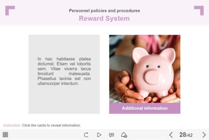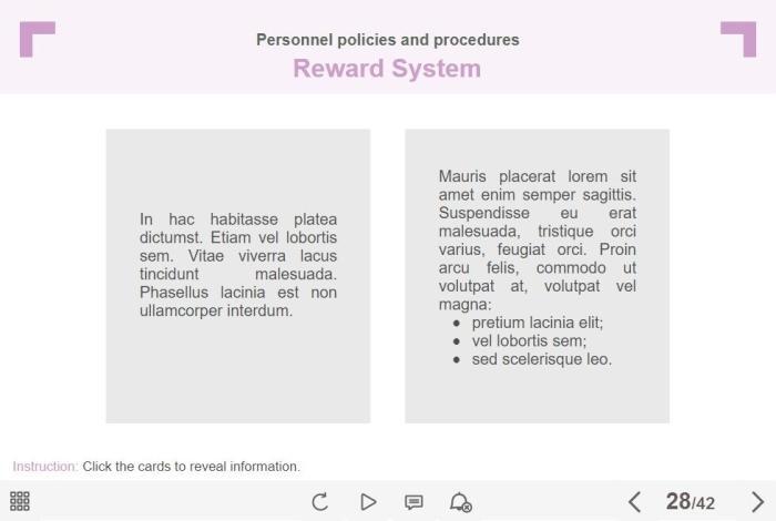 Two Flip Cards — Lectora Template. The template contains two flip cards which contain the text and image learning content. The user must click on each of them to reveal the additional text information. This Lectora interaction slide is a part of the Travel Industry Welcome Course Starter Template. It can be used for creating any type of eLearning courses with Lectora Publisher / Inspire 16 or higher. The template is a ready-made product that works well in PCs, laptops and tablets with screen size larger than 7 inches. Feel free to browse through our ready-made Lectora templates library and pick any ones to create own visual stories.