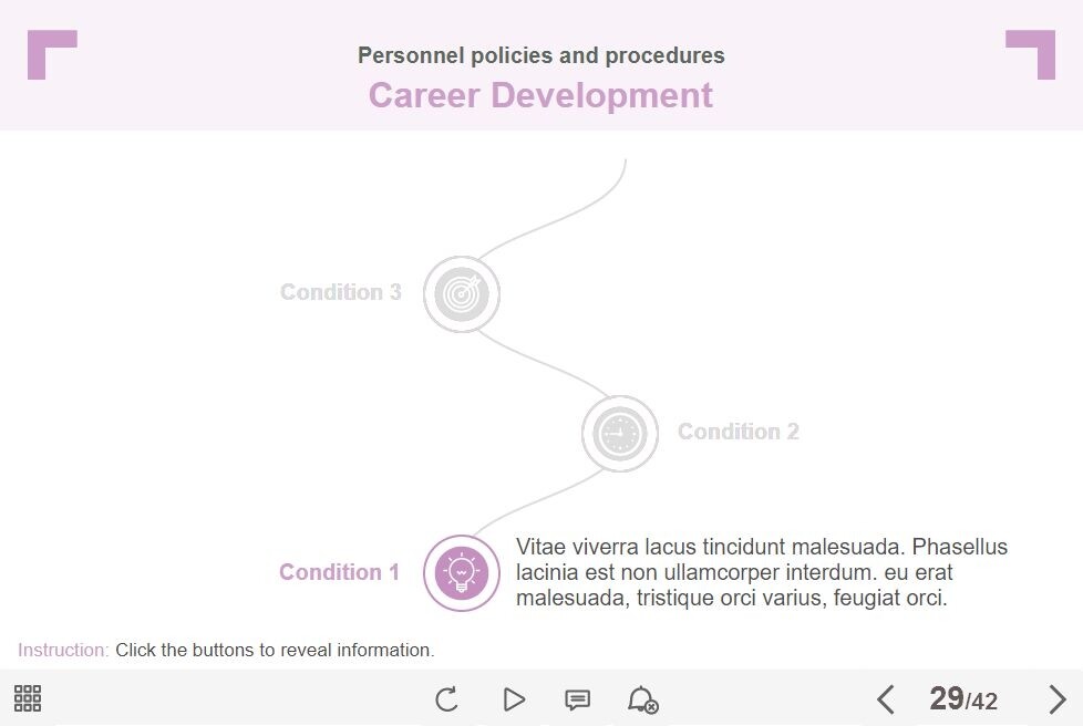 Three Clickable Icons — Lectora Template. The template contains three clickable objects represented in the form of the round icons. The user must click on each of them to reveal the additional information. This Lectora interaction slide is a part of the Travel Industry Welcome Course Starter Template. It can be used for creating any type of eLearning courses with Lectora Publisher / Inspire 16 or higher. The template is a ready-made product that works well in PCs, laptops and tablets with screen size larger than 7 inches. Feel free to browse through our ready-made Lectora templates library and pick any ones to create own visual stories.