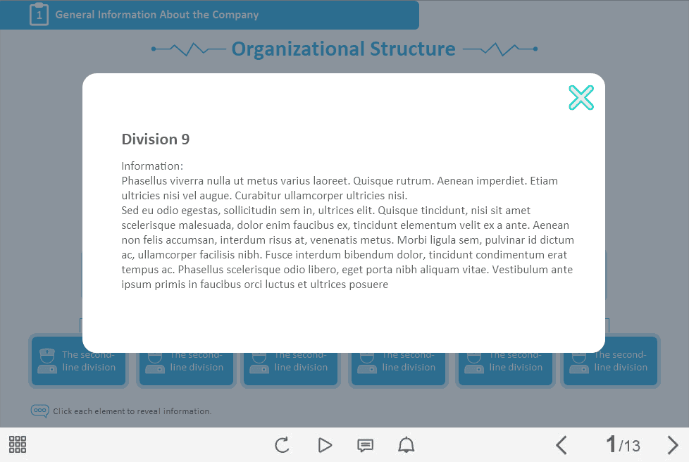 Lectora Medical Institution Organizational Structure Template. This ready-made interactive slide would be a great choice for creating e-courses on medical and healthcare themes. It contains 11 clickable buttons designed as turquoise rectangulars. The student must click on each button to reveal the course information. The template is based on Lectora Publisher 16. We’ve collected lots of Lectora Templates which belong to needs of different industries. Now it’s even easier to create an e-learning course from scratch: just select the course template you like and fill it with any number of powerful and attractive interactions!