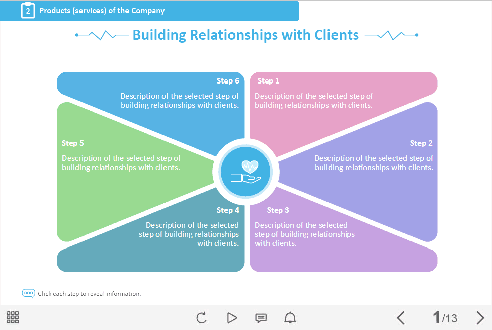 - Features: clickable visual objects designed for prudent use of slide space
