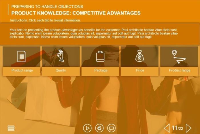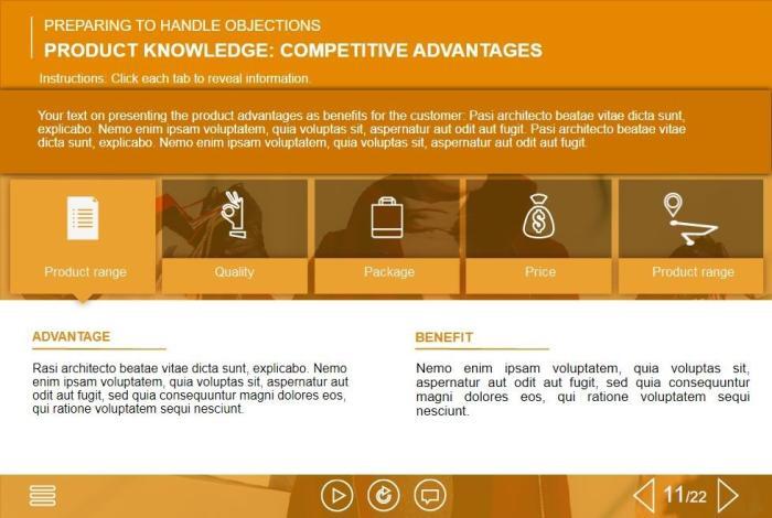 Tabs with Competitive Advantages — Lectora Template. The unique eLearning interaction is designed with Lectora Publisher 16 software. It is fully compatible with the most recent versions of Lectora Inspire and Publisher tools. The template contains five tabs with icons which are placed at the right part of the screen. The user must click on them to reveal the additional materials. The template slide is a ready-made product: all you need is to insert it into the projects and fill with own training content. We recommend to launch it on the devices with the screen size more than 7 inches. We’ve collected lots of Trivantis Lectora templates to speed up the course development and to save you from routine work.