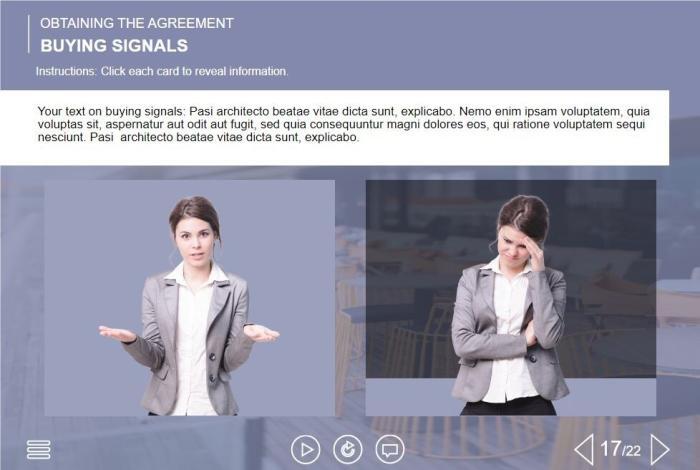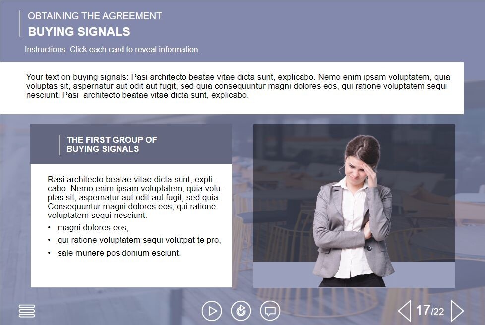 Flip Cards with Cutout Business Lady — Lectora Template. The unique eLearning interaction is designed with Trivantis Lectora 16 software. It is fully compatible with the most recent versions of Lectora Publisher / Inspire tools. The template contains two flip cards placed at the center of the screen. The user must click on them to reveal the additional materials. The template slide is a ready-made product: all you need is to insert it into the projects and fill with own training content. We recommend to launch it on the devices with the screen size more than 7 inches. We’ve collected lots of Trivantis Lectora templates to speed up the course development and to save you from routine work.