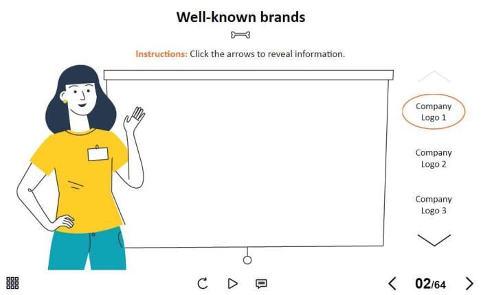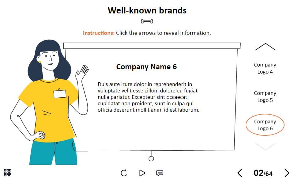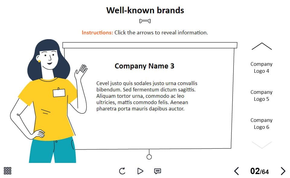 Vertical Slideshow — Lectora Template. The unique eLearning interaction is designed with Lectora 18 software. The template contains 5 slides with a control panel at the right part of the screen. The user must click on the up and down arrows to switch between the slides. The interactive slide is a ready-made product: all you need is to insert it into the projects and fill with own training content. We recommend to launch it on the devices with the screen size more than 7 inches. We’ve collected lots of Trivantis Lectora templates to speed up the course development and to save you from routine work.