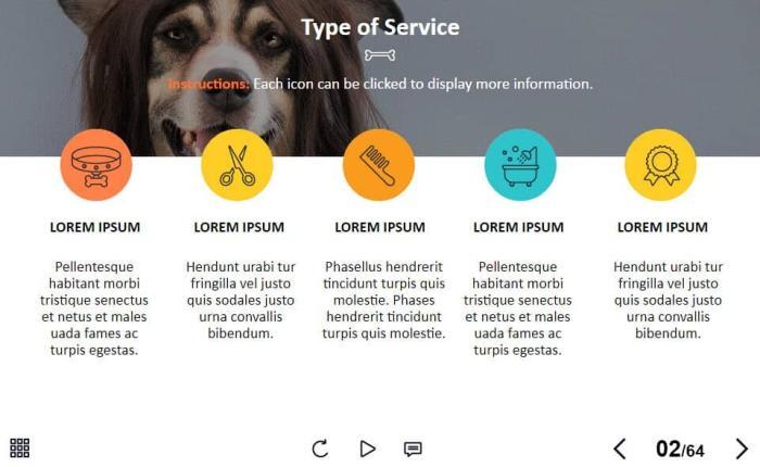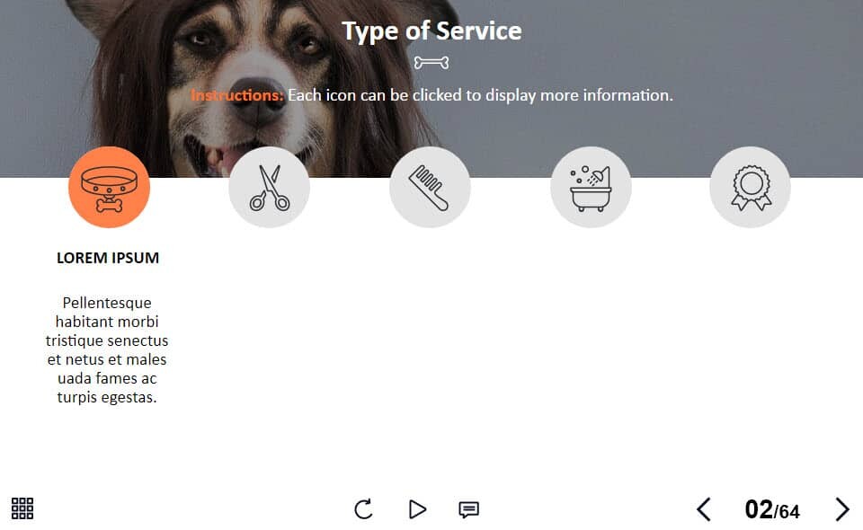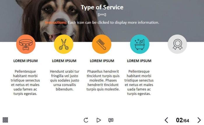 Icon Buttons — Lectora Template. The unique eLearning interaction is designed with Lectora 18 software. The template contains 5 round buttons with icons. The user must click on each of them to reveal the additional materials. The interactive slide is a ready-made product: all you need is to insert it into the projects and fill with own training content. We recommend to launch it on the devices with the screen size more than 7 inches. We’ve collected lots of Trivantis Lectora templates to speed up the course development and to save you from routine work.