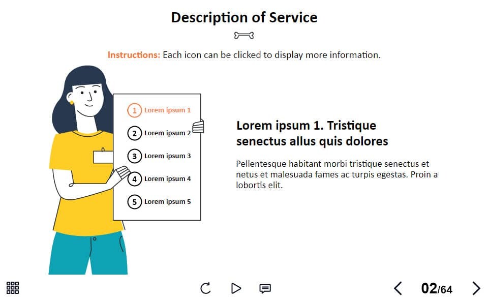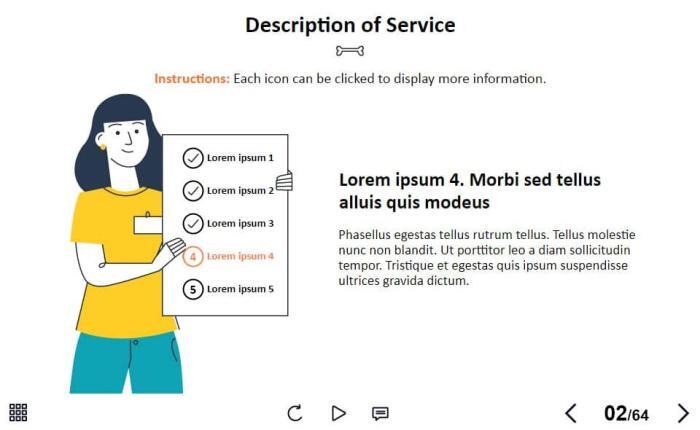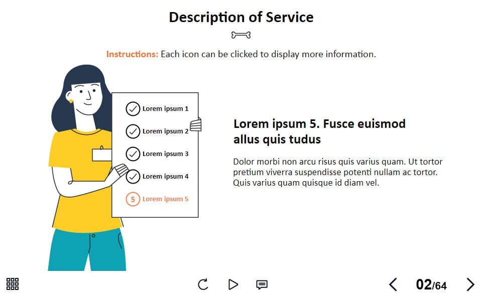 Five Tabs on Board — Lectora Template. The unique eLearning interaction is designed with Lectora 18 software. The template contains 5 tabs placed on a board. The user must click on each tab to reveal the additional materials. The interactive slide is a ready-made product: all you need is to insert it into the projects and fill with own training content. We recommend to launch it on the devices with the screen size more than 7 inches. We’ve collected lots of Trivantis Lectora templates to speed up the course development and to save you from routine work.