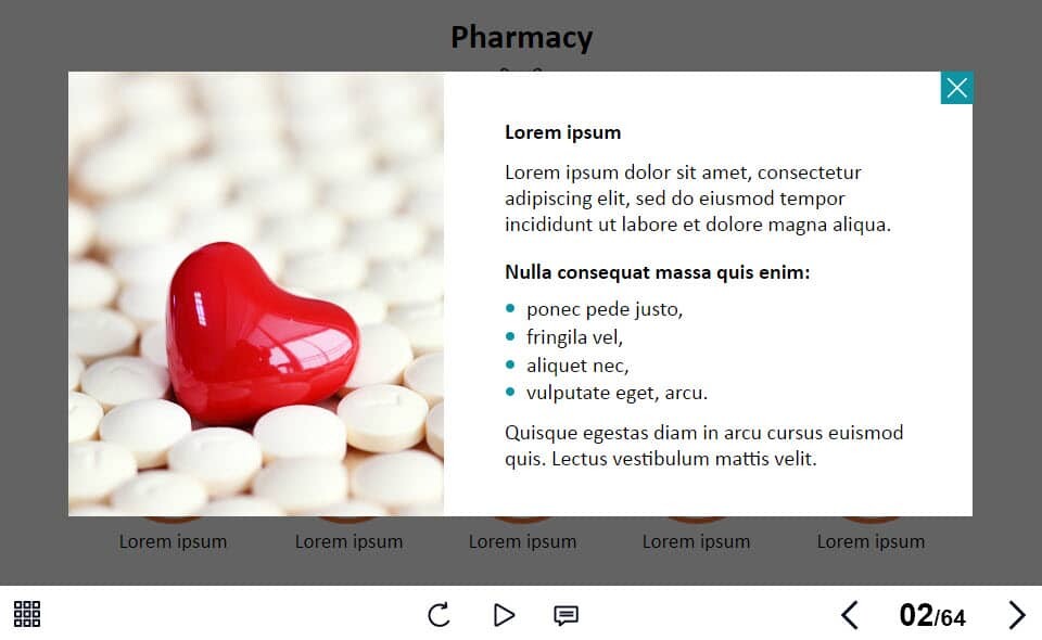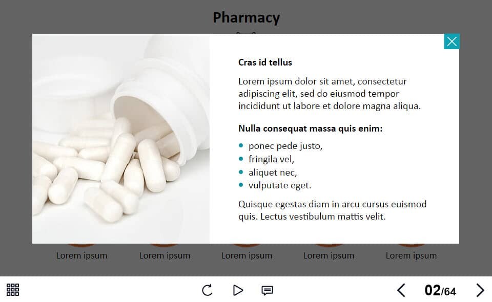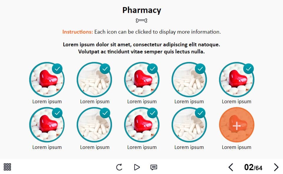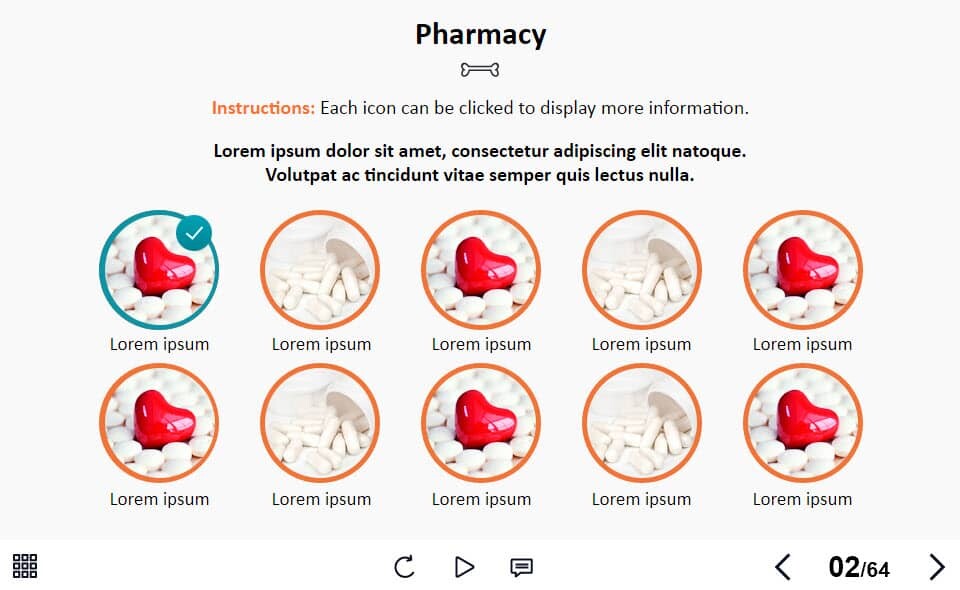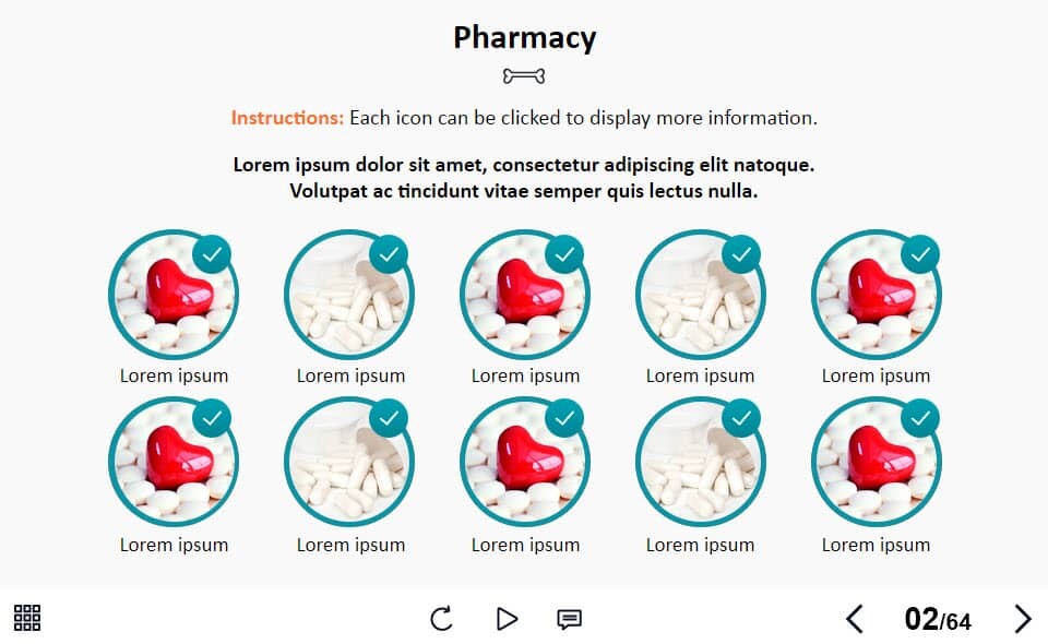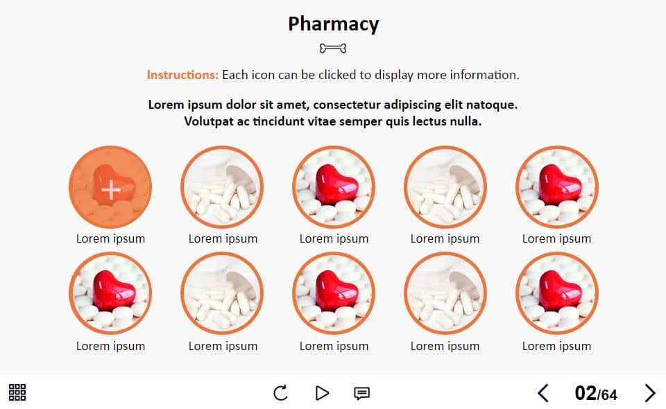 Grid Round Images — Lectora Template. The unique eLearning interaction is designed with Lectora 18 software. The template contains 10 clickable images. The user must click on each image to reveal the additional materials in pop-ups. The interactive slide is a ready-made product: all you need is to insert it into the projects and fill with own training content. We recommend to launch it on the devices with the screen size more than 7 inches. We’ve collected lots of Trivantis Lectora templates to speed up the course development and to save you from routine work.