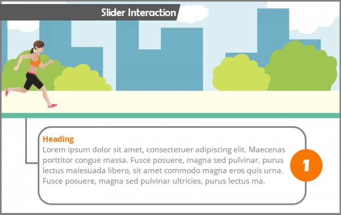 Running Character — Storyline 360 Slider Template. Based on Storyline 360 software. There are six checkpoints that are designed to show any type of text information. User must click each area in front of the character to make her move and to reveal the popup window. This Storyline Interaction will turn the boring educational process into a fascinating game. The template is already designed and prepared for usage. Perfectly runs on both PC and tablet. Storyline templates are very popular tools among e-course developers. They offer a wide range of features that makes storyline templates unique and innovative.