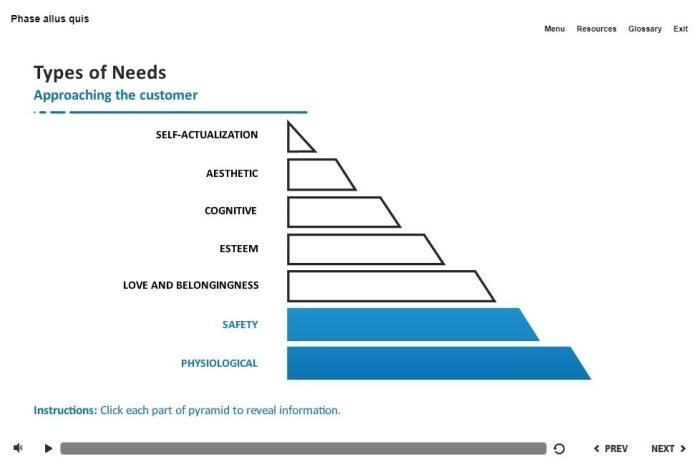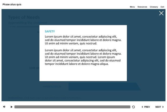 Types of Needs Infographics — Storyline Template. The unique eLearning interaction is designed with Articulate Storyline 2 software. It is fully compatible with the most recent versions: Storyline 3 and 360. The template contains seven clickable objects on a chart. The user must click on each of them to reveal the additional information in pop-ups. The template slide is a ready-made product: all you need is to insert it into the projects and fill with own training content. We recommend to launch it on the devices with the screen size more than 7 inches. We’ve collected lots of Articulate Storyline templates to speed up the course development and to save you from routine work.