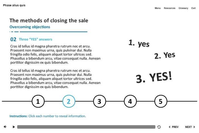 Closing the Sale Tabs — Storyline Template. The unique eLearning interaction is designed with Articulate Storyline 2 software. It is fully compatible with the most recent versions: Storyline 3 and 360. The template contains five numerix tabs. The user must click on each tab to reveal the additional information. The template slide is a ready-made product: all you need is to insert it into the projects and fill with own training content. We recommend to launch it on the devices with the screen size more than 7 inches. We’ve collected lots of Articulate Storyline templates to speed up the course development and to save you from routine work.