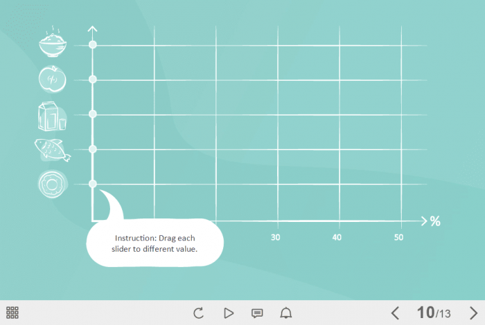 Interactive Chart — Storyline 3 / 360 Template. The eLearning interaction slide would become a great addition for your eCourse. It contains 5 draggable sliders placed on a chart. The user must drag each slider to the right to reveal the additional information. The template is compatible with Storyline 3 / 360 software. All you need is just to paste the template into your project and to fill it with own learning materials. Try to create better courses with our amazing Articulate Storyline templates!