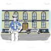 Officer Stands In Front Of Police Station Vector Background. Young policeman is standing in front of the two-storey police department. Highly professionally designed. This background would be a perfect addition for your own elearning projects. Available in two formats: raster (.PNG) and vector (.EPS). It can be customized with other chips. You can modify the vector one according to your requirements. Be sure that our high-quality artworks will become a great helper to make learners experience better!
