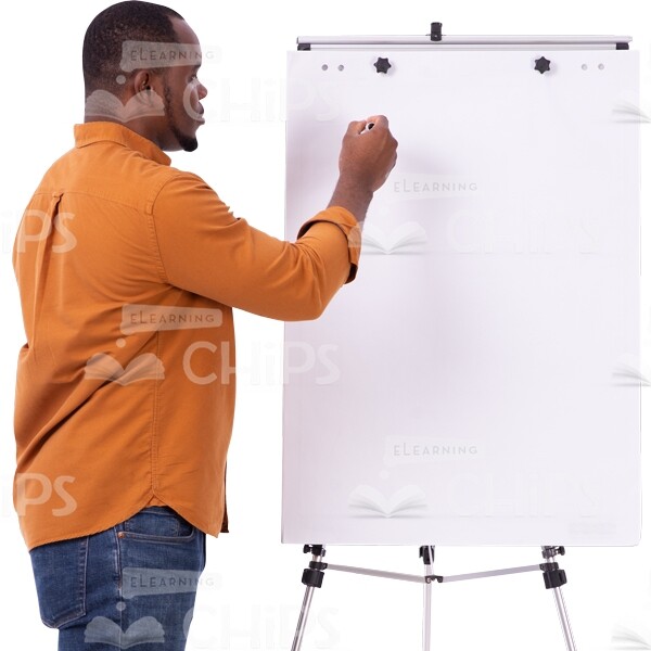 - Appearance: African American, male, young man, guy, account manager, worker, office employee, handsome, nice, good-looking, educated, clever, dark hair, adult, short haircut, attractive, serious, calm, focused, concentrated, confident, strong, standing, for content, looking on paper, raised arm, thoughtful, thinking, pointing, keeping marker in hand, with flipchart on left side, presents, quarter-turned, flipchart with white blank paper, flipchart, looks on board, back to camera, side view, white board, making a presentation, recording by marker, focus on, writes in the middle, holds in right arm marker, making notes, profile, black marker, writing on flipchart;