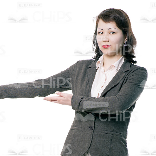 High-quality cutout picture of an Asian young woman standing in full length. She is holding a presentation while gesturing with both hands. Her eyes are looking directly at the camera. Can be used as a teacher, tutor or course narrator. Would perfectly illustrate the common situations during learning process.