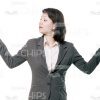 Full-length cutout picture of a young woman spreads her arms. She is looking at the right hand with a particular interest. Can be used as a teacher, tutor or course narrator. Would perfectly illustrate the common situations during learning process.