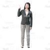 High-quality cutout image of a young woman standing upright. She focuses attention on what is at the top while points upwards. Dressed in grey pants, white shirt and dark-grey jacket.