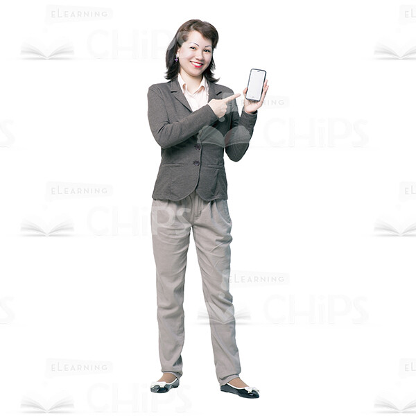 Full-length cutout photo of a presentable young woman pointing on the mobile phone. She is holding it is her left hand while pointing with the right one. Looks cheerful and smiling. Alena wears casual clothes such as grey pants, white shirt, and dark grey jacket. This photo would perfectly illustrate a person during the training session. Can be used in e-learning projects, marketing and advertisements. It is presented with a transparent background.
