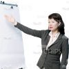 - Appearance: Asian, young woman, with flipchart, presenting, pointing, half-turned, nice, serious, focused, calm, attractive;