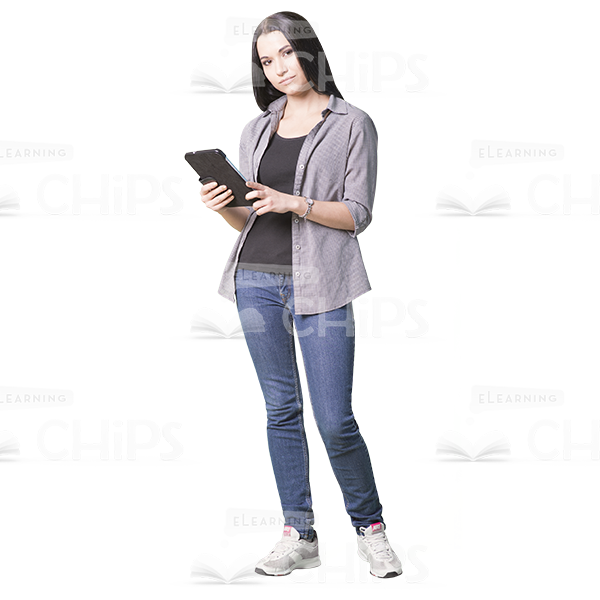 - Appearance: European, young girl, woman, good-looking, nice, focused with tablet, using tablet, with iPad, using ipad;
