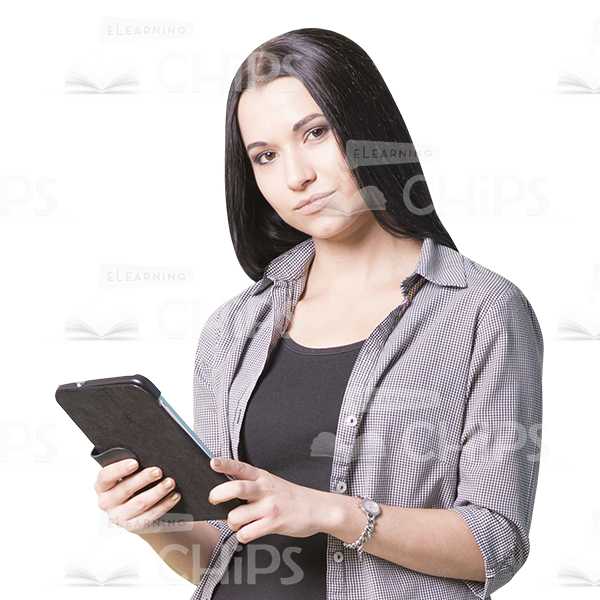 Full-length cutout image of focused woman with a tablet. Alisa is looking aside fully concentrated.